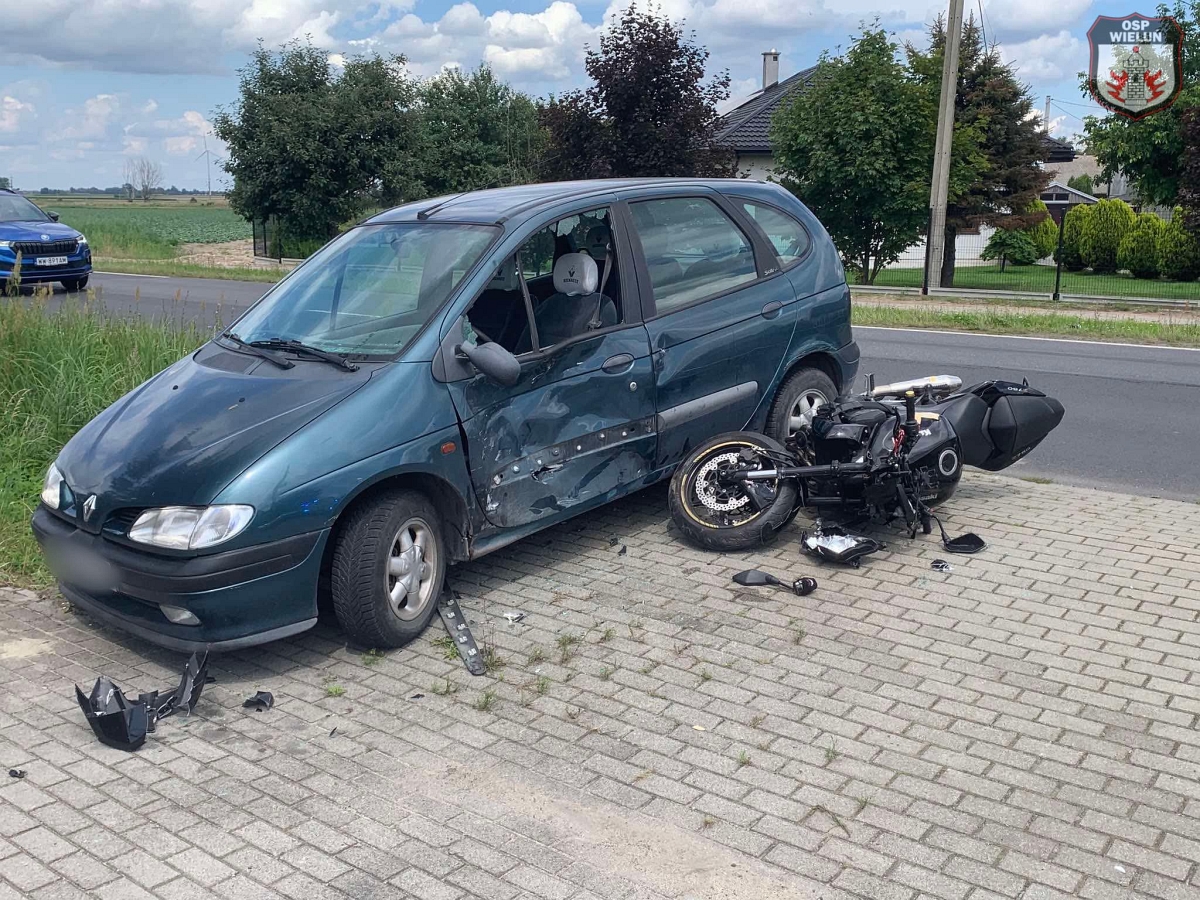Zdarzenie miało miejsce w godzinach południowych i zaangażowało dwa pojazdy: samochód osobowy marki Renault oraz motocykl marki Kawasaki. Na miejsce zadysponowano, oprócz Zespołu Ratownictwa Medycznego i wieluńskiej policji, dwa zastępy JRG Wieluń oraz jeden OSP KSRG Wieluń.