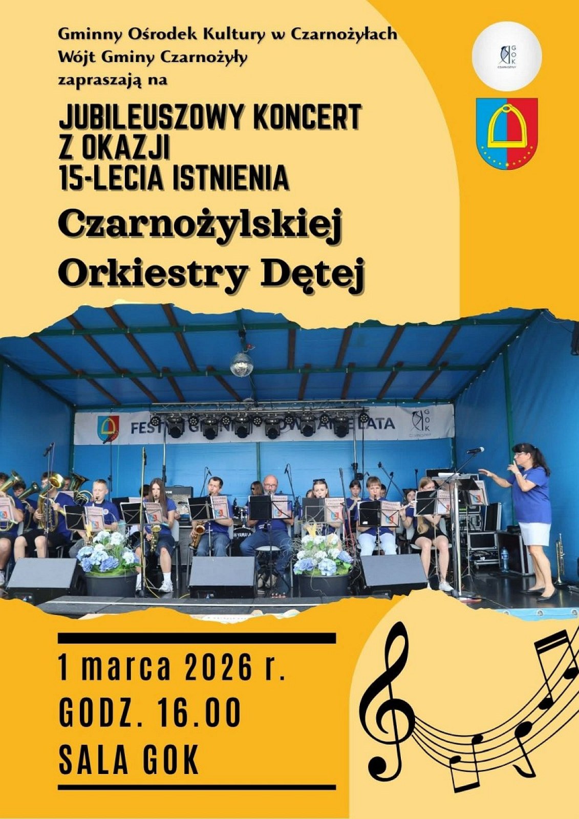 Jubileuszowy koncert z okazji 15-lecia istnienia Czarnożylskiej Orkiestry Dętej odbędzie się o godz. 16:00 w sali widowiskowej Gminnego Ośrodka Kultury w Czarnożyłach. Przed nami wyjątkowe muzyczne popołudnie, pełne wspomnień.