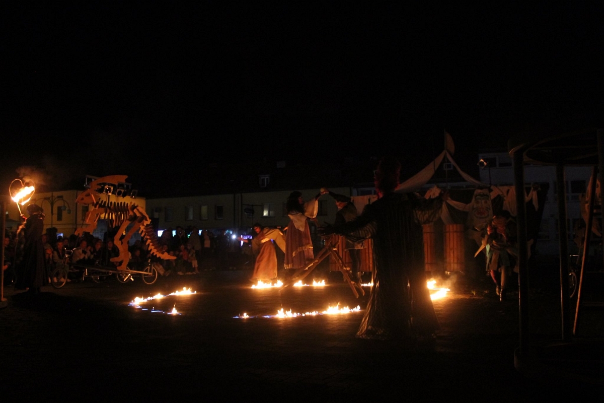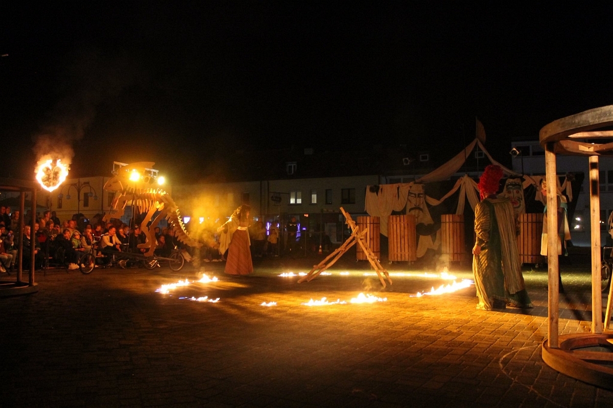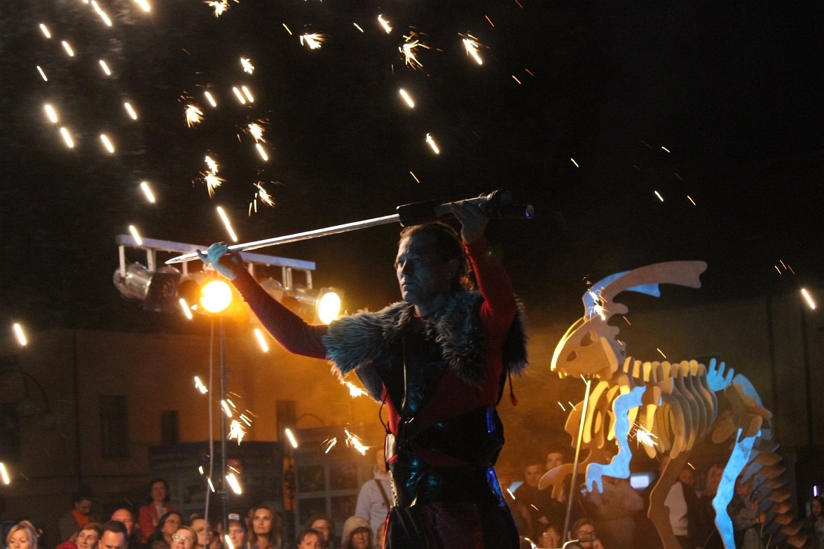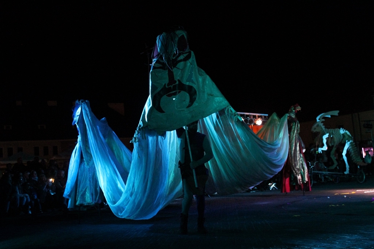 „Spotkać Prospera” było niczym otwarcie drzwi do świata, w którym granice między snem a jawą zacierają się, a każda scena tętni życiem i magią. Inspirowane dramatami Williama Szekspira: „Burzą”, „Romeem i Julią”, „Hamletem” oraz „Snem nocy letniej” widowisko zamieniło plac w bajkową przestrzeń pełną ruchu, kolorów i niespodzianek. Na oczach widzów pojawiały się postacie na szczudłach, ubrane w fantazyjne, bogate stroje a obok nich metalowe figury, ogromne machiny, rozświetlone lampiony i migoczące płomienie ognia. Wśród nich wszystkich przewodnikiem był czarodziej Prospero, postać, która symbolicznie prowadziła wszystkich w stronę marzeń i iluzji, gdzie wszystko staje się możliwe.