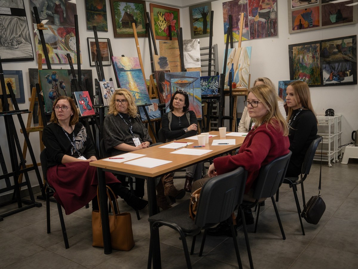 Następnego dnia Forum przeniosło się do klimatycznej przestrzeni Dworca Kulturalnego Wieluń-Dąbrowa. Drugi dzień rozpoczął się wyjątkowym doświadczeniem: wspólną relaksacją przy dźwiękach nietypowych instrumentów, które pozwoliły wszystkim zatrzymać się na chwilę, odetchnąć i zanurzyć w refleksji. Z tej spokojnej atmosfery uczestnicy płynnie przeszli do intensywnych zajęć warsztatowych z filcowania i malowania na szkle, szkolenia dotyczącego pracy z osobami ze szczególnymi potrzebami, spotkania poświęconego archiwistyce społecznej oraz zajęć rozwojowych skierowanych do pracowników kultury.