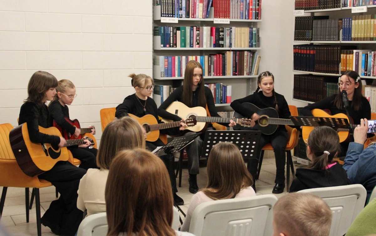 W bibliotece dziś odbył się „Koncert gitarowy na sześć strun”! Na scenie zaprezentowały się dzieci i młodzież – uczestnicy koła gitarowego działającego w Powiatowym Młodzieżowym Domu Kultury i Sportu w Wieluniu, prowadzonego przez panią Aleksandrę Sobańską.