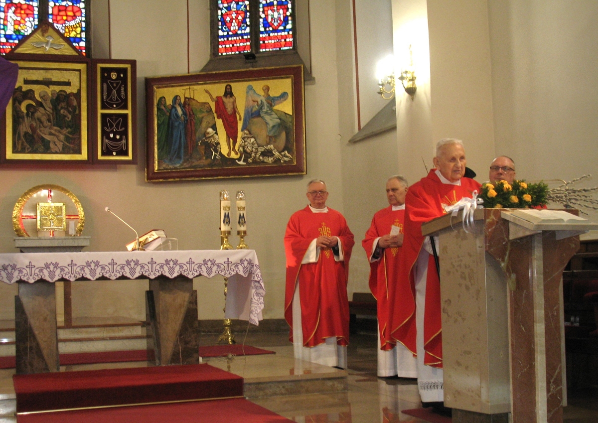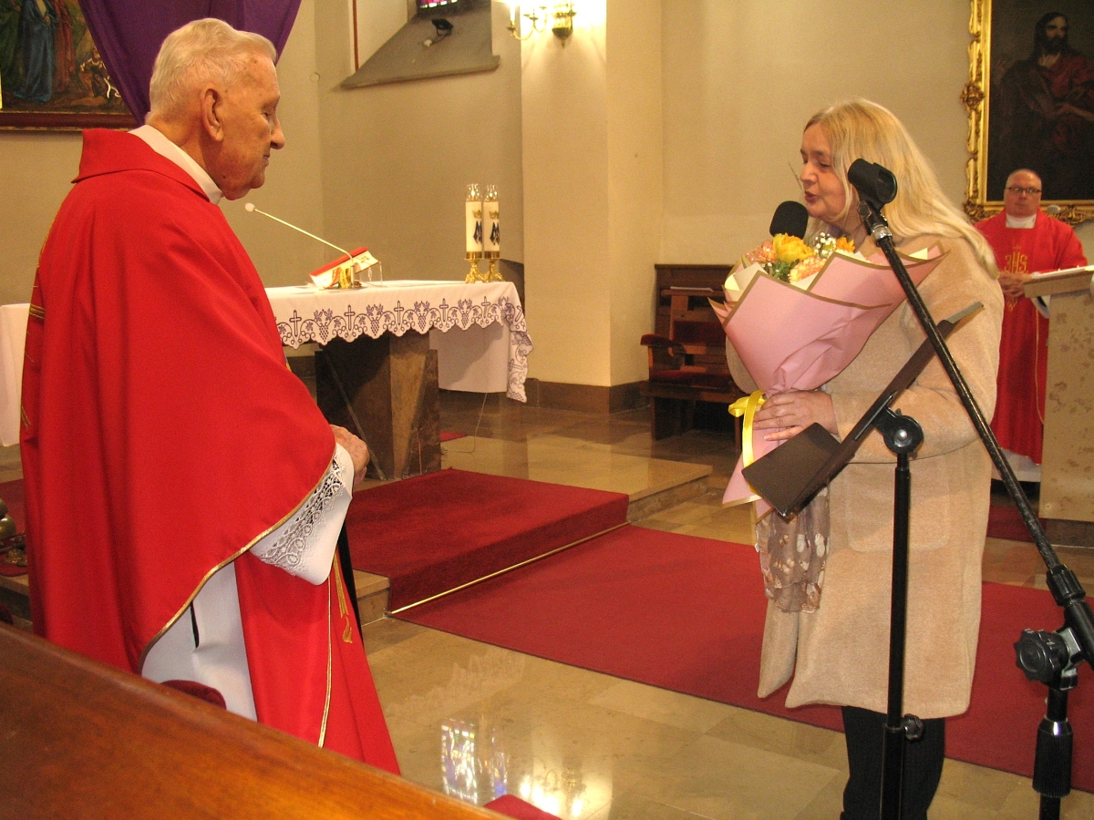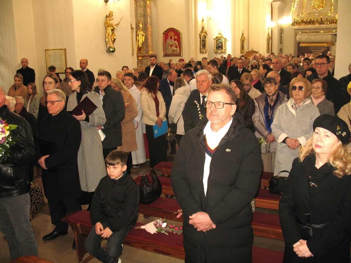 Spotkanie w Muzeum Ziemi Wieluńskiej było pięknym preludium do niedzielnej Mszy Świętej dziękczynnej sprawowanej w intencji ks. Prałata w Sanktuarium Matki Bożej Pocieszenia. Obok księdza Prałata, który modlił się w intencji zmarłych parafian, byli księża: ks. Jarosław Boral, ks. Adam Sołtysiak, ks. Jacek Zieliński, modlący się w intencji jubilata. Liturgię swoim śpiewem ubogacała schola parafialna.