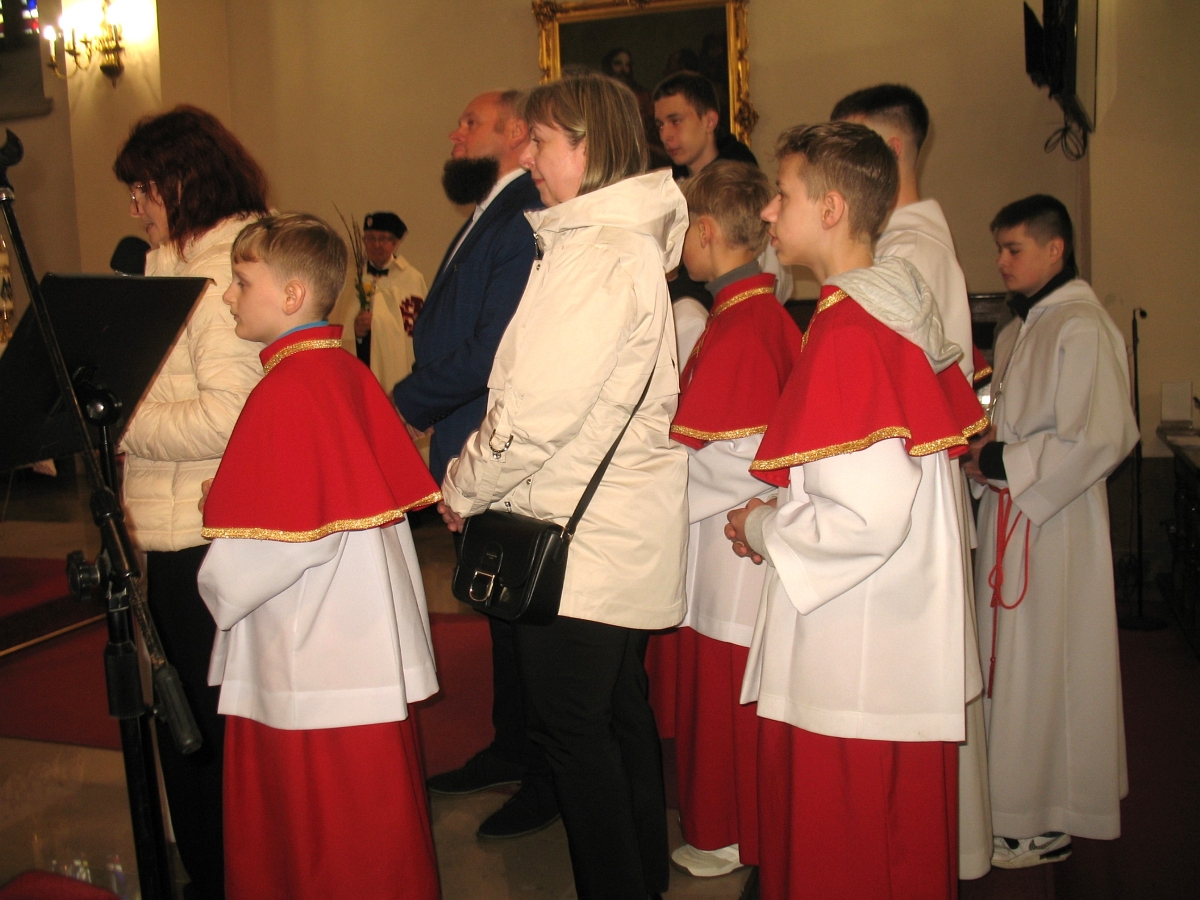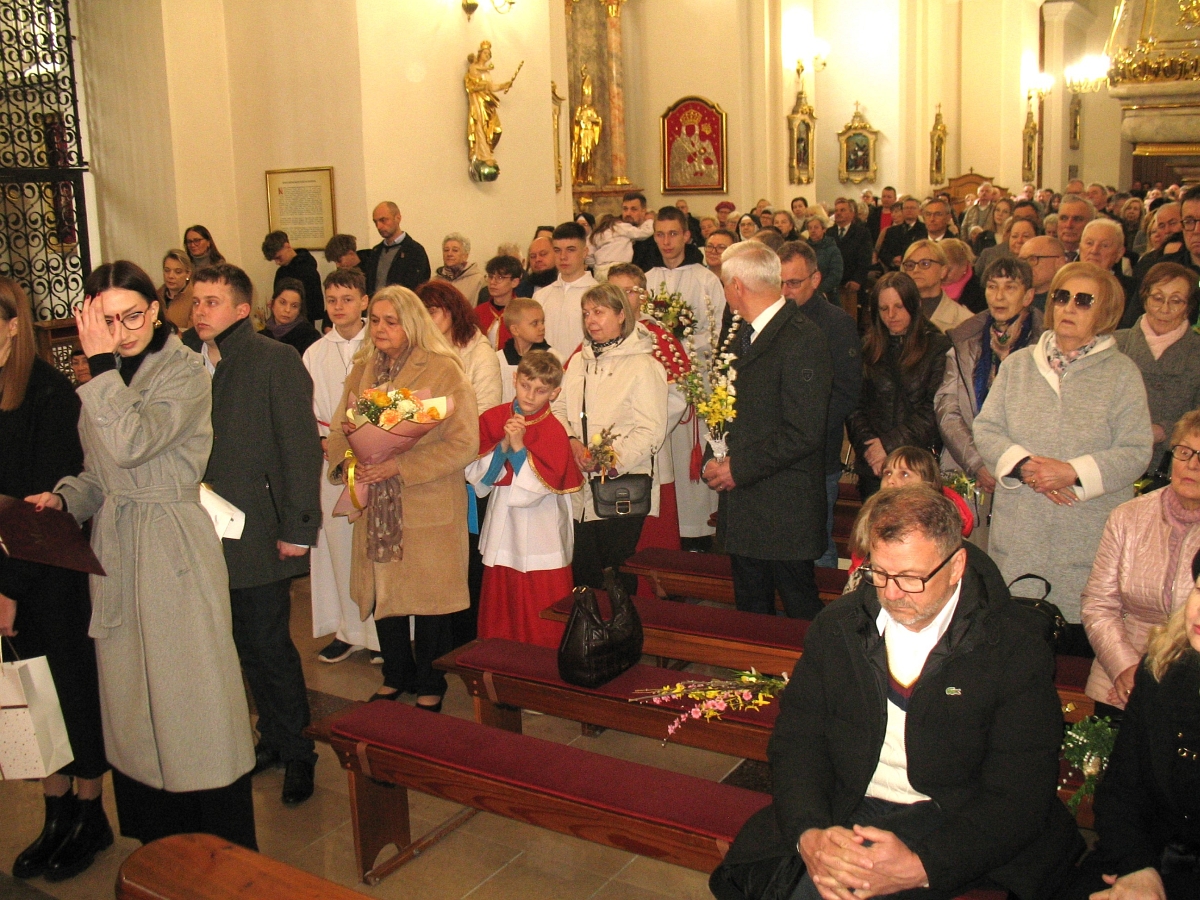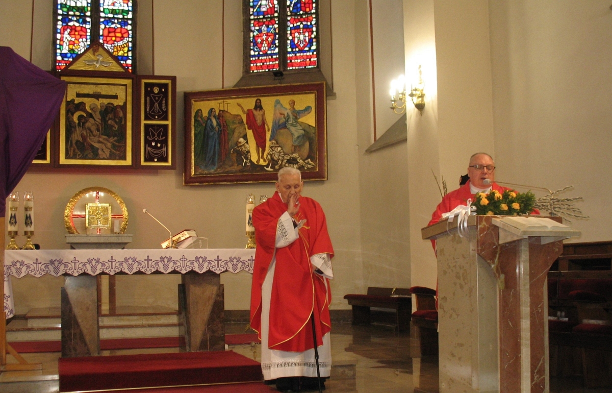 Spotkanie w Muzeum Ziemi Wieluńskiej było pięknym preludium do niedzielnej Mszy Świętej dziękczynnej sprawowanej w intencji ks. Prałata w Sanktuarium Matki Bożej Pocieszenia. Obok księdza Prałata, który modlił się w intencji zmarłych parafian, byli księża: ks. Jarosław Boral, ks. Adam Sołtysiak, ks. Jacek Zieliński, modlący się w intencji jubilata. Liturgię swoim śpiewem ubogacała schola parafialna.