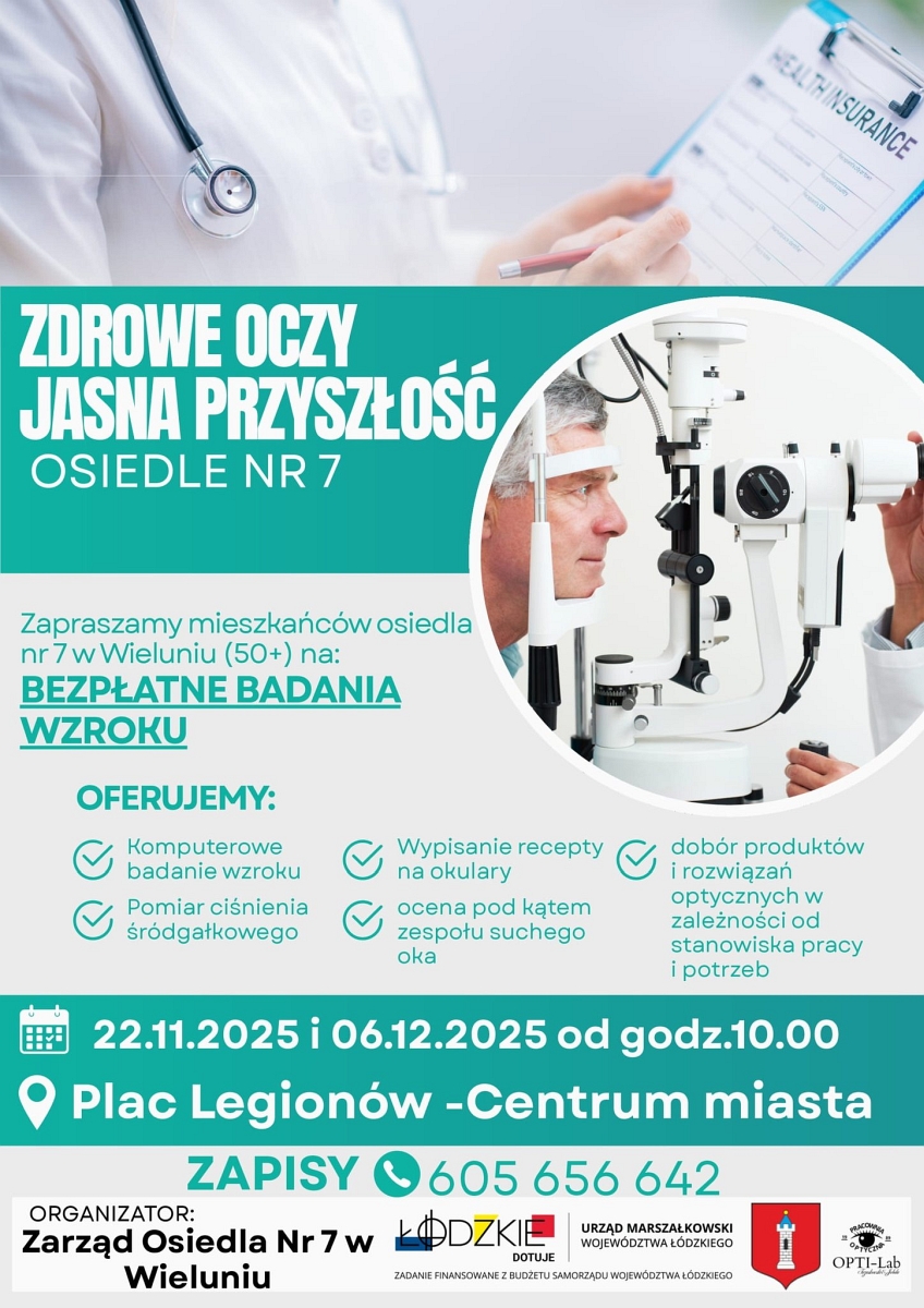 22 listopada oraz 6 grudnia odbędą się bezpłatne badania wzroku dla mieszkańców osiedla nr 7 w Wieluniu w wieku 50+.