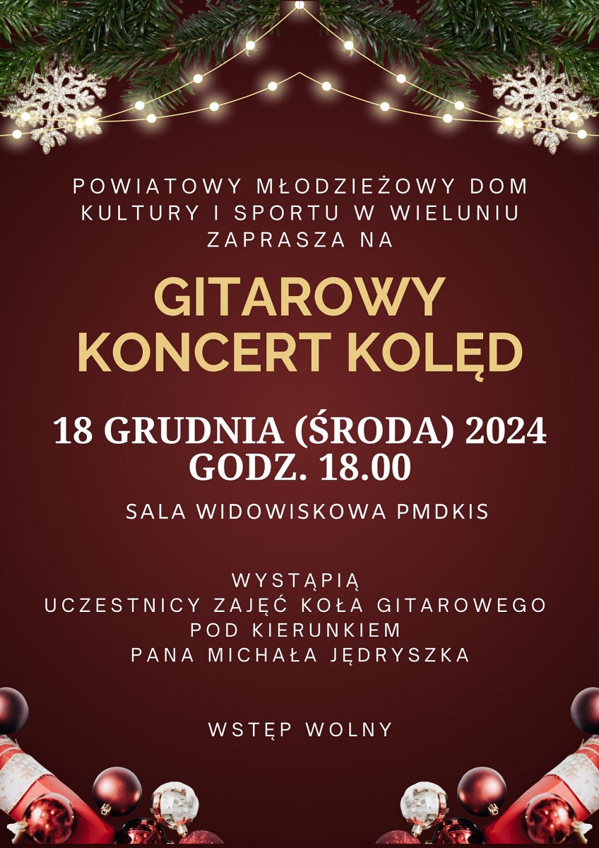 Koncert, w wykonaniu gitarzystów prowadzonych przez Michała Jędryszka, odbędzie się o godz. 18:00 w sali widowiskowej Powiatowego Młodzieżowego Domu Kultury i Sportu w Wieluniu. Wstęp wolny.