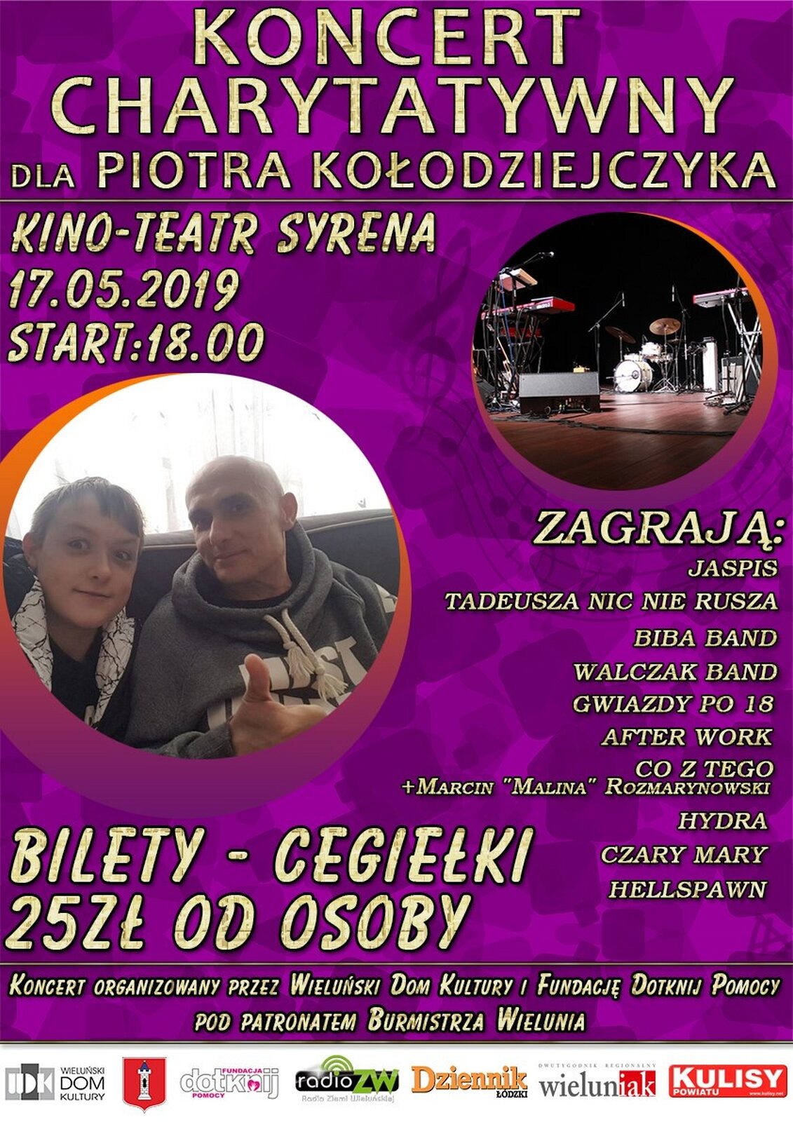 Serdecznie zapraszamy, 17 maja o godz. 18:00 do Kino-Teatru Syrena w Wieluniu, na koncert charytatywny, z którego dochód wesprze leczenie Piotra Kołodziejczyka.