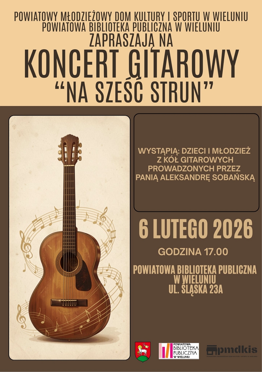 Koncert, w którym wystąpią dzieci i młodzież z kół gitarowych Powiatowego Młodzieżowego Domu Kultury i Sportu prowadzonych przez Aleksandrę Sobanską, odbędzie się w Powiatowej Bibliotece Publicznej w Wieluniu przy ul. Śląskiej 23a.