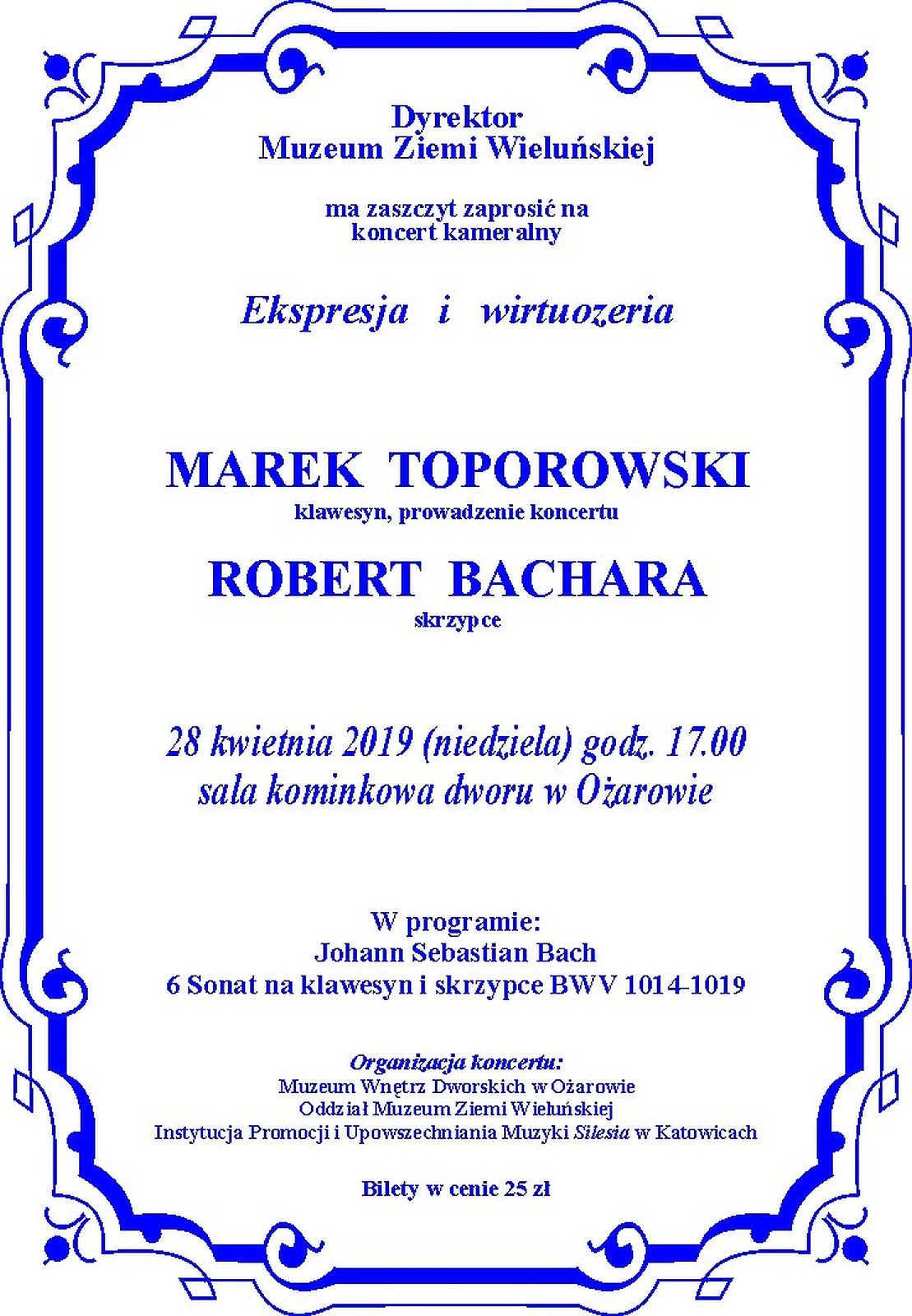 Dyrektor Muzeum Ziemi Wieluńskiej ma zaszczyt zaprosić na koncert kameralny w wykonaniu: Marka Toporowskiego (klawesyn, prowadzenie koncertu) i Roberta Bachary (skrzypce).