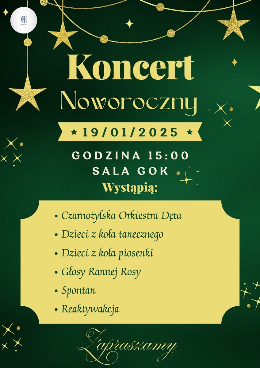 Podczas Koncertu Noworocznego w sali GOK w Czarnożyłach wystąpią: Czarnożylska Orkiestra Dęta, dzieci z koła tanecznego i koła piosenki, Głosy Rannej Rosy, Spontan oraz Reaktywacja.