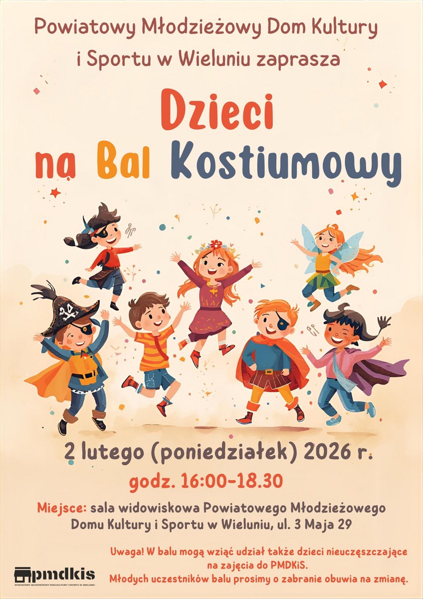 W poniedziałek, 2 lutego, w sali widowiskowej Powiatowego Młodzieżowego Domu Kultury i Sportu w Wieluniu, przy ul. 3 Maja 29, odbędzie się dla dzieci bal kostiumowy.