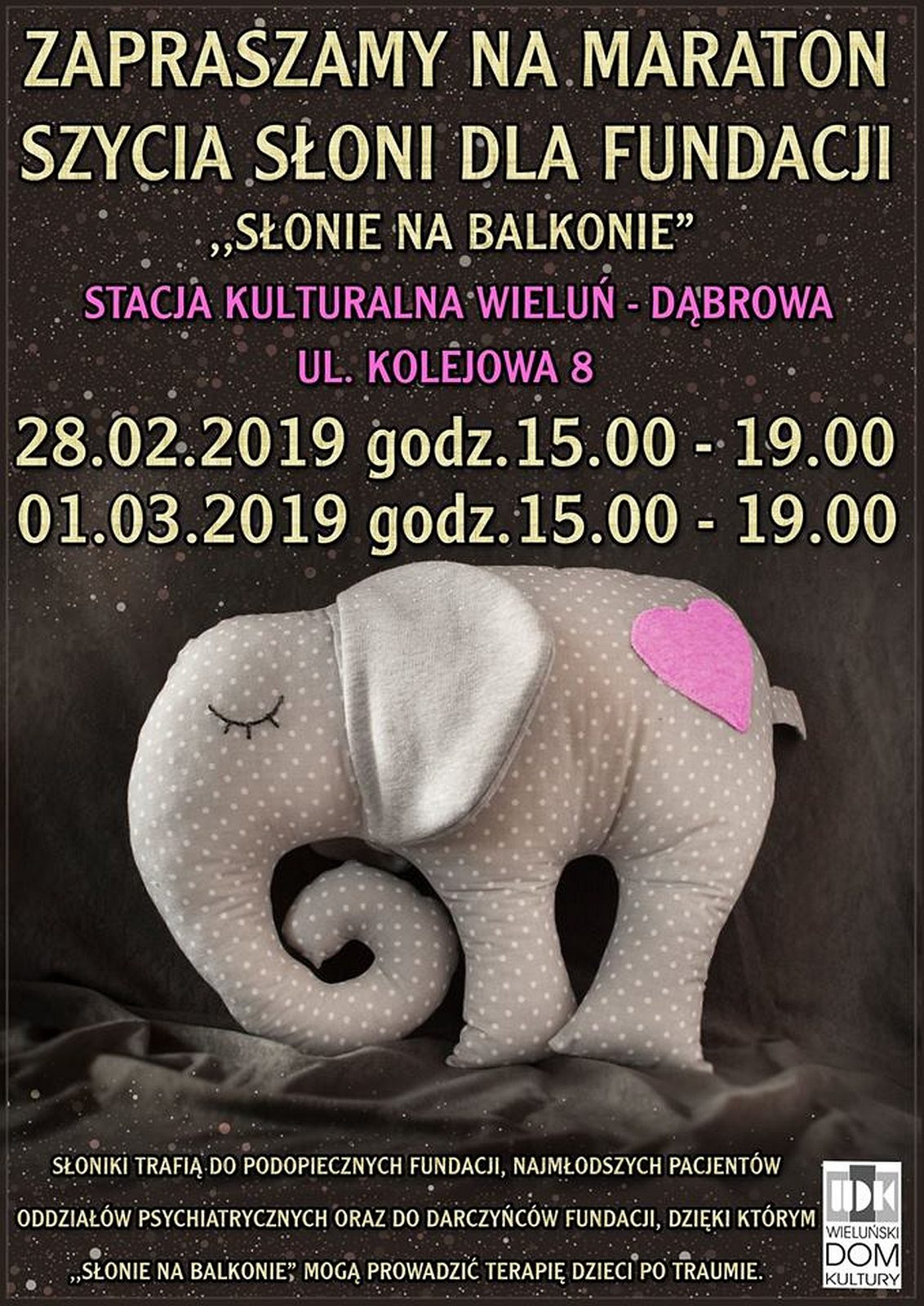 28 lutego oraz 1 marca na Stacji Kulturalnej Wieluń – Dąbrowa odbędzie się Maraton szycia słoni dla Fundacji „Słonie na balkonie”. Szczegóły na plakacie.