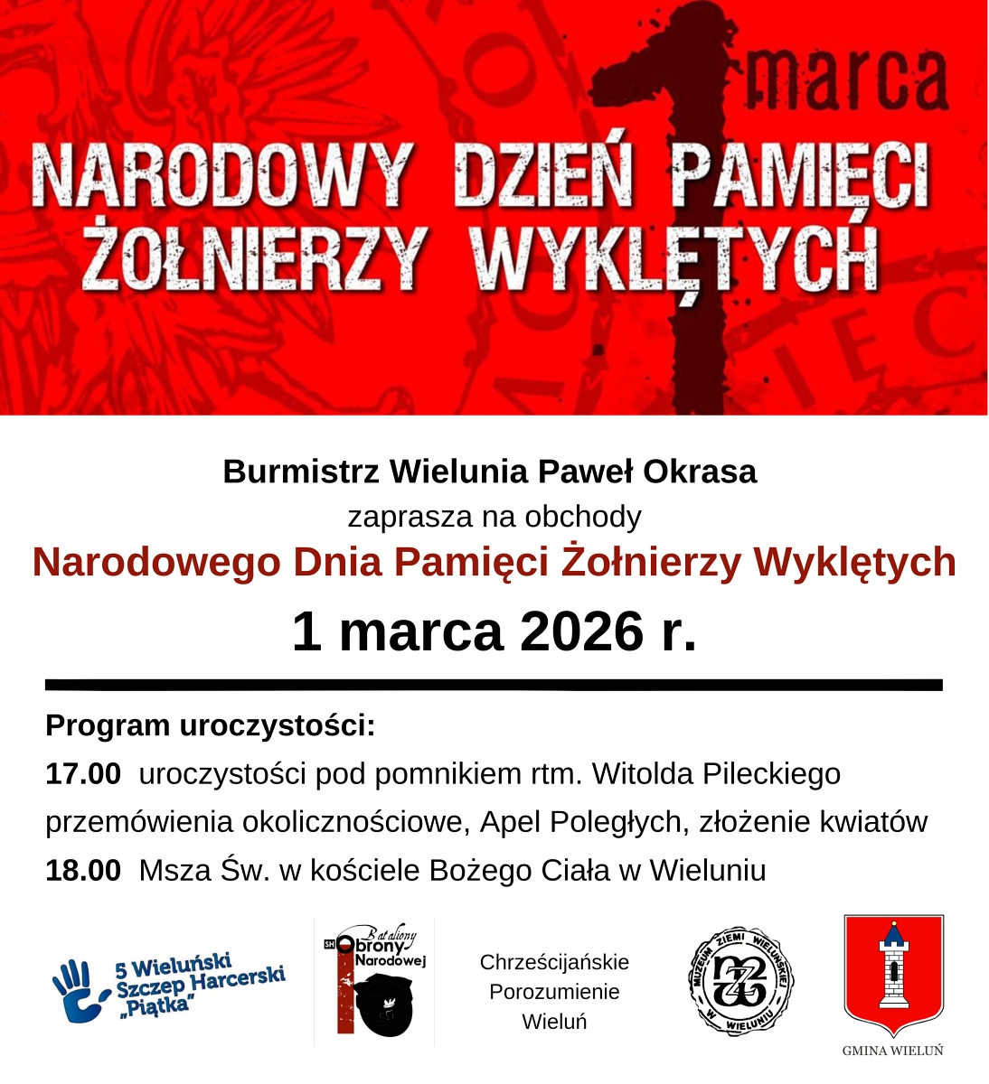 Wieluńskie obchody odbędą się w parku przy pomniku rotmistrza Witolda Pileckiego, gdzie mieszkańcy miasta oddadzą hołd bohaterom. Następnie o godzinie 18:00 w kolegiacie pw. Nawiedzenia Najświętszej Maryi Panny odprawiona zostanie uroczysta Msza święta w intencji poległych i zamordowanych żołnierzy podziemia niepodległościowego.