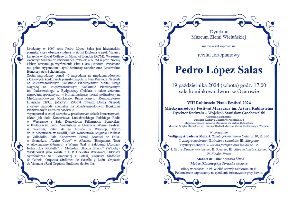 W sobotę, 19 października o godz. 17:00 w Muzeum Wnętrz Dworskich w Ożarowie, odbędzie się występ utalentowanego młodego artysty Pedro Lópeza Salas.