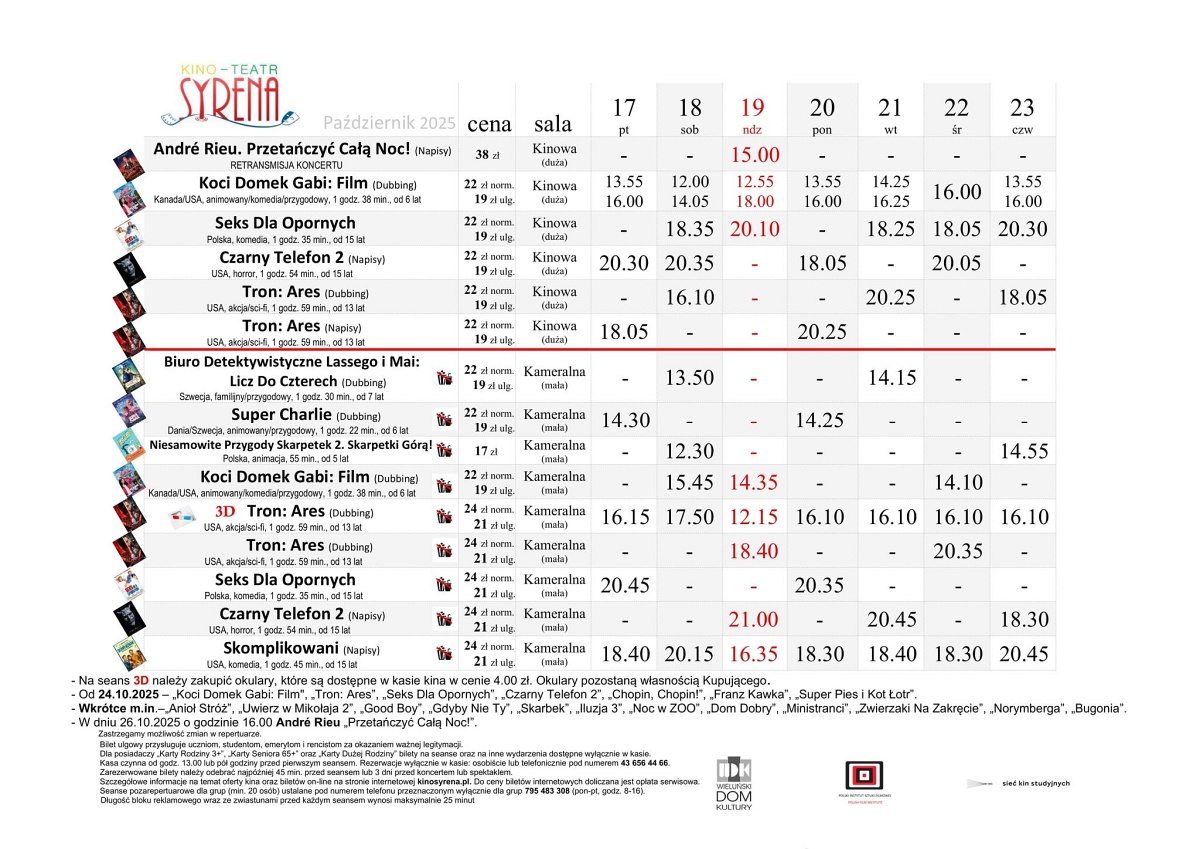 Nowy repertuar będzie grany na deskach „Syreny” w dniach od 17 do 23 października. Szczegóły w naszym artykule: tutaj oraz na plakacie.