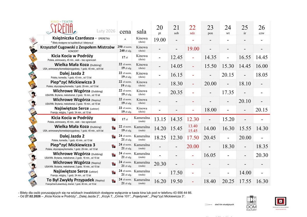 Nowy repertuar będzie grany na deskach „Syreny” w dniach w dniach od 20 do 26 lutego. Szczegóły na plakacie.