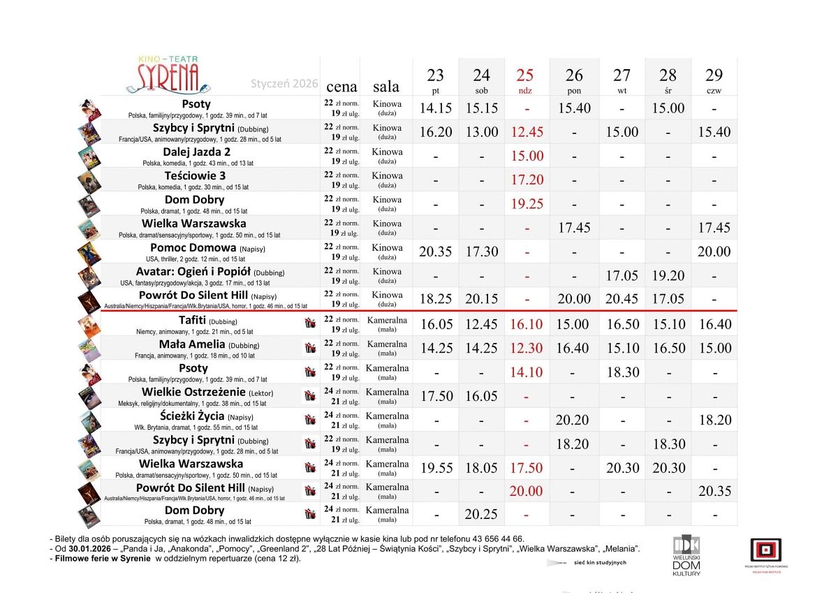 Nowy repertuar będzie grany na deskach „Syreny” w dniach w dniach od 23 do 29 stycznia. Szczegóły z na plakacie.