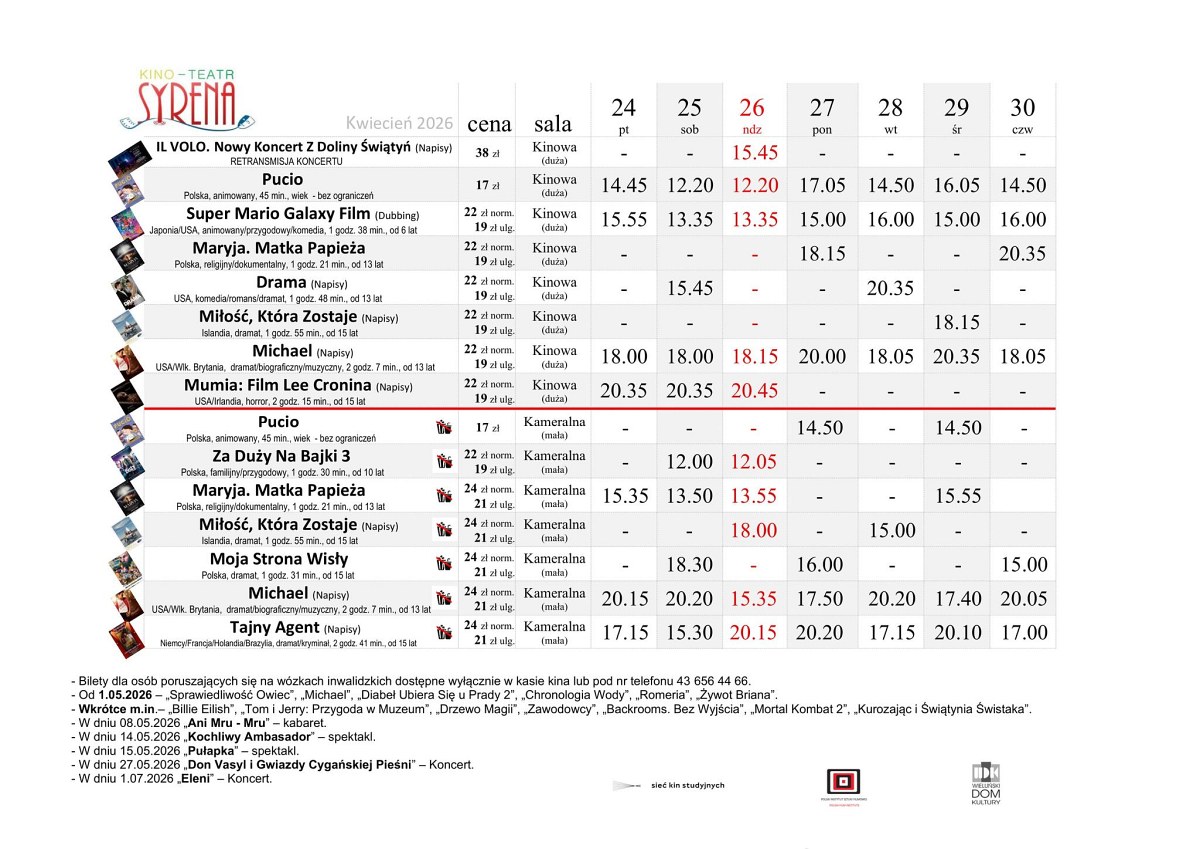 Nowy repertuar będzie grany na deskach „Syreny” w dniach w dniach od 24 do 30 kwietnia. Szczegóły na plakacie.