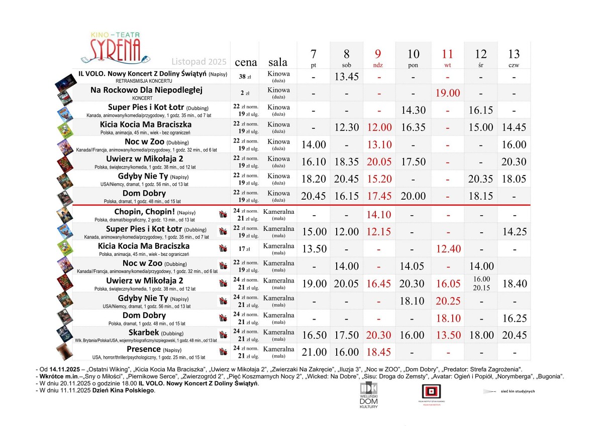 Nowy repertuar będzie grany na deskach „Syreny” w dniach od 7 do 13 listopada. Szczegóły na plakacie.