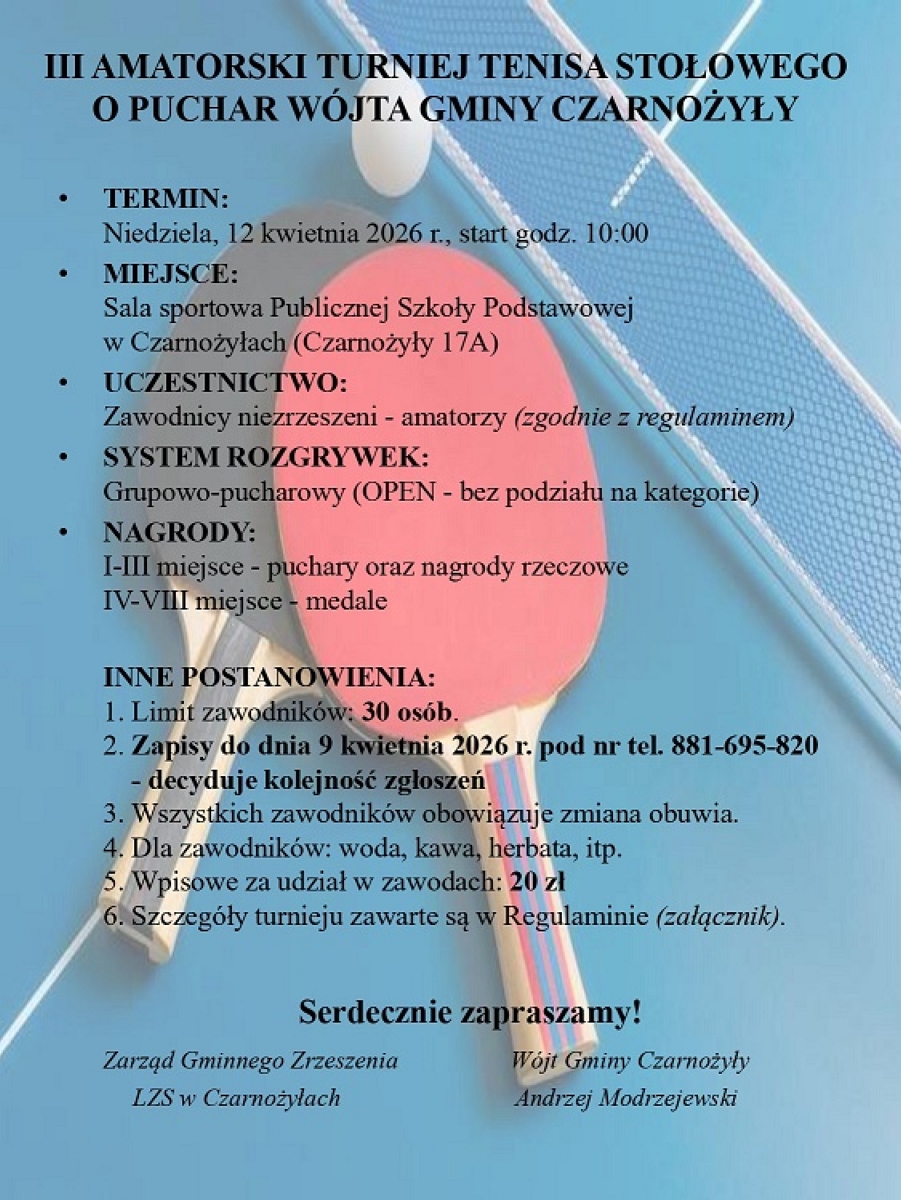 W dniu 12 kwietnia (niedziela) o godz. 10:00 odbędzie się III Amatorski Turniej Tenisa Stołowego o Puchar Wójta Gminy Czarnożyły.
