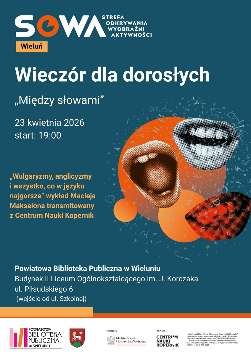 W dniu 23 kwietnia, o godz. 19:00 w Strefie Odkrywania, Wyobraźni i Aktywności (budynek II LO, wejście od ul. Szkolnej w Wieluniu), odbędzie się wyjątkowy wieczór dla dorosłych pod hasłem „Między słowami”.