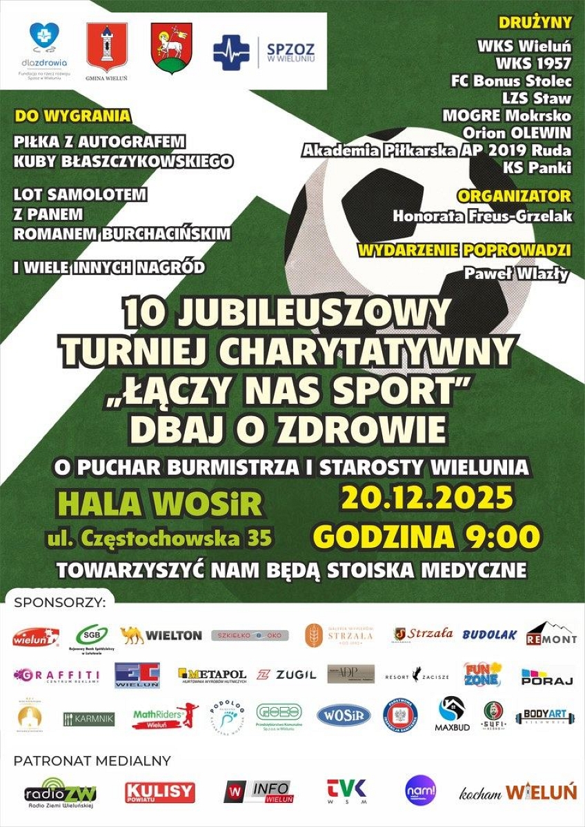 Turniej o Puchar Burmistrza Gminy Wieluń oraz Starosty Powiatu Wieluńskiego, zespołów z rocznika 2016 i 2017 odbędzie się 20 grudnia w hali WOSiR przy ul. Częstochowskiej 35 w Wieluniu. Turniej ma na celu zebranie funduszy na zakup sprzętu medycznego dla oddziału ortopedycznego.