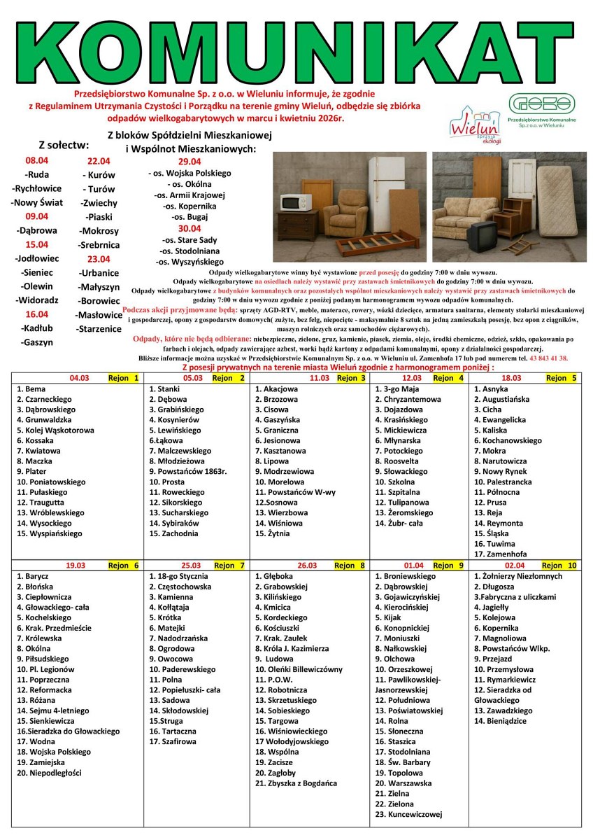 Przedsiębiorstwo Komunalne Sp. z o.o. w Wieluniu informuje, że zgodnie z Regulaminem Utrzymania Czystości i Porządku na terenie Gminy Wieluń odbędzie się zbiórka odpadów wielkogabarytowych.