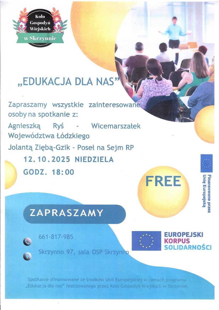 Koło Gospodyń Wiejskich w Skrzynnie serdecznie zaprasza wszystkie zainteresowane osoby na spotkanie w dniu 12 października 2025 r. o godz. 18,00 z Agnieszką Ryś – Wicemarszałek Województwa Łódzkiego oraz Jolantą Ziębą-Gzik – Posłanką na Sejm RP w ramach programu „Edukacja dla nas”.