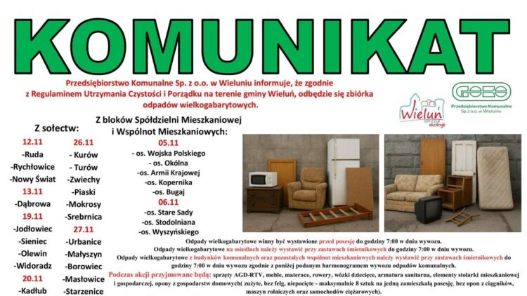 Przedsiębiorstwo Komunalne Sp. z o.o. w Wieluniu informuje, że na terenie gminy Wieluń trwa zbiórka odpadów wielkogabarytowych.