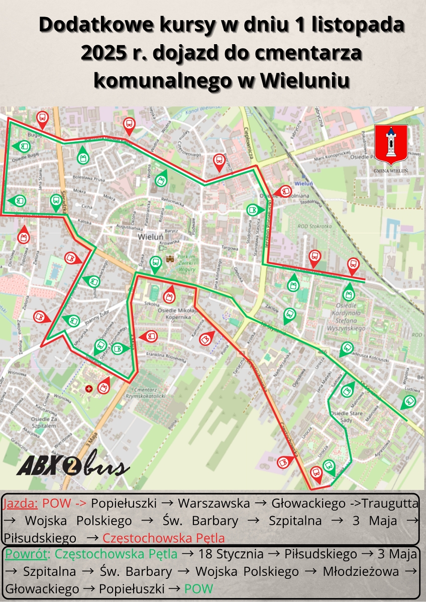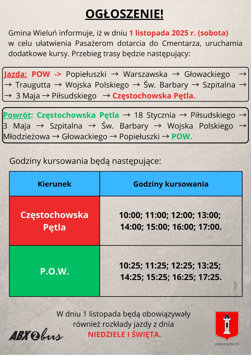 Władze miasta, reagując na inicjatywę zgłoszoną przez Obywatelski Wieluń podczas ostatniej sesji Rady Miejskiej, postanowiły uruchomić dodatkowe kursy autobusów. 1 listopada autobusy będą kursować zgodnie z obowiązującym rozkładem jazdy dla niedziel i świąt, ale również według specjalnego, dodatkowego rozkładu, który ma zapewnić większą częstotliwość połączeń. Dzięki temu mieszkańcy będą mogli wygodnie i bezpiecznie dotrzeć na cmentarze bez konieczności stania w korkach i szukania wolnego miejsca parkingowego.