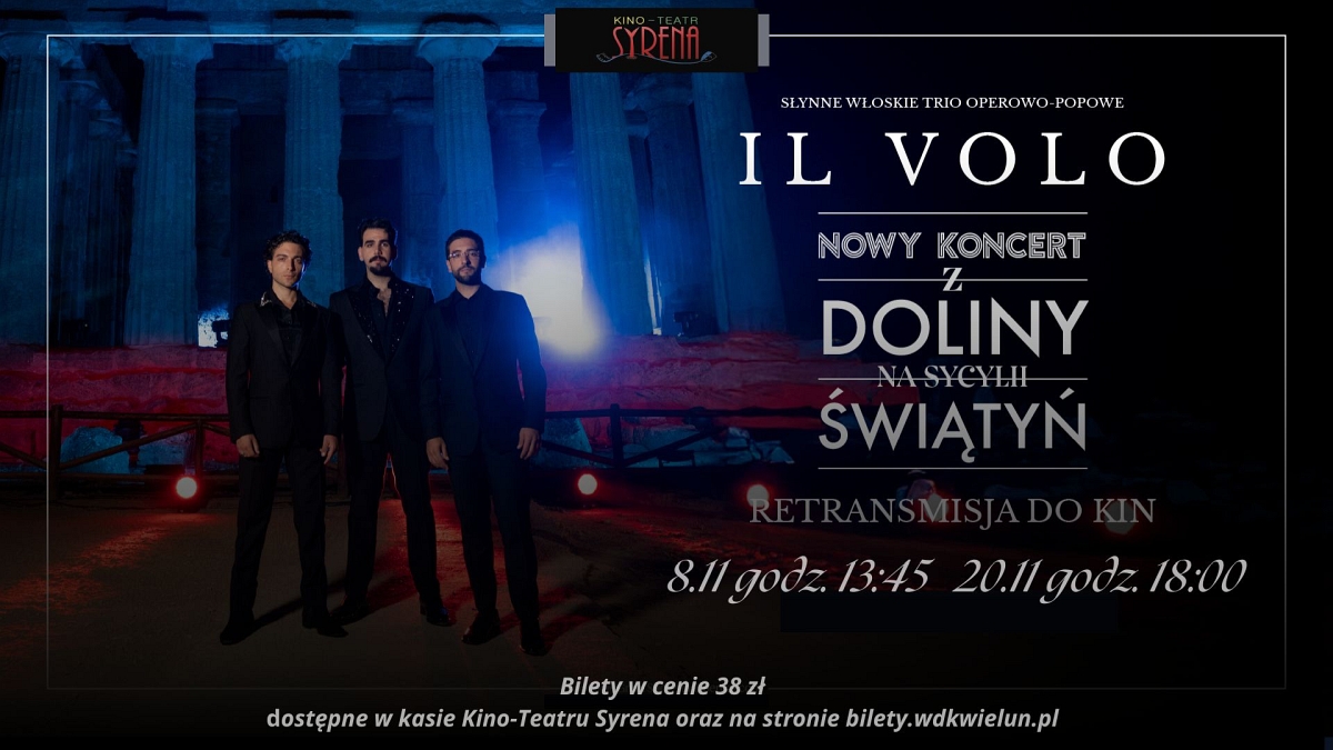 IL VOLO. Nowy Koncert z Doliny Świątyń – RETRANSMISJA – Zanurz się w niezwykły muzyczny spektakl tria Il Volo – trzech utalentowanych Włochów, którzy łączą operę z muzyką pop. W programie usłyszysz legendarne arie („Nessun dorma”, „La donna è mobile”), filmowe i musicalowe hity, włoskie klasyki oraz „Hallelujah” Leonarda Cohena. Koncert, nagrany latem 2024 roku w malowniczej Dolinie Świątyń na Sycylii, zachwycił publiczność na całym świecie. Teraz jego kinowa retransmisja pozwala przeżyć to wyjątkowe wydarzenie jeszcze raz.