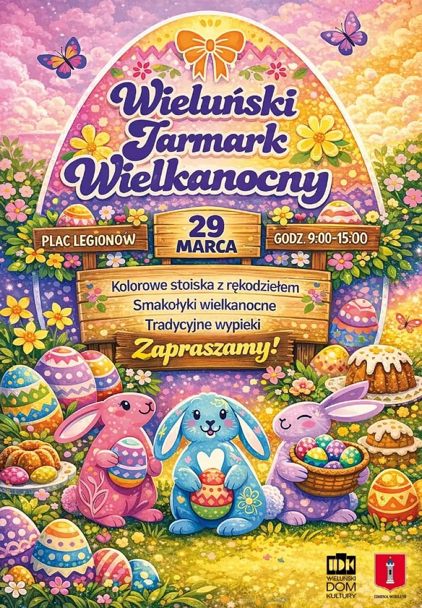 Wieluński Dom Kultury serdecznie zaprasza na Wieluński Jarmark Wielkanocny, który odbędzie się w niedzielę 29 marca w godz. 9:00–15:00 na Placu Legionów w Wieluniu.